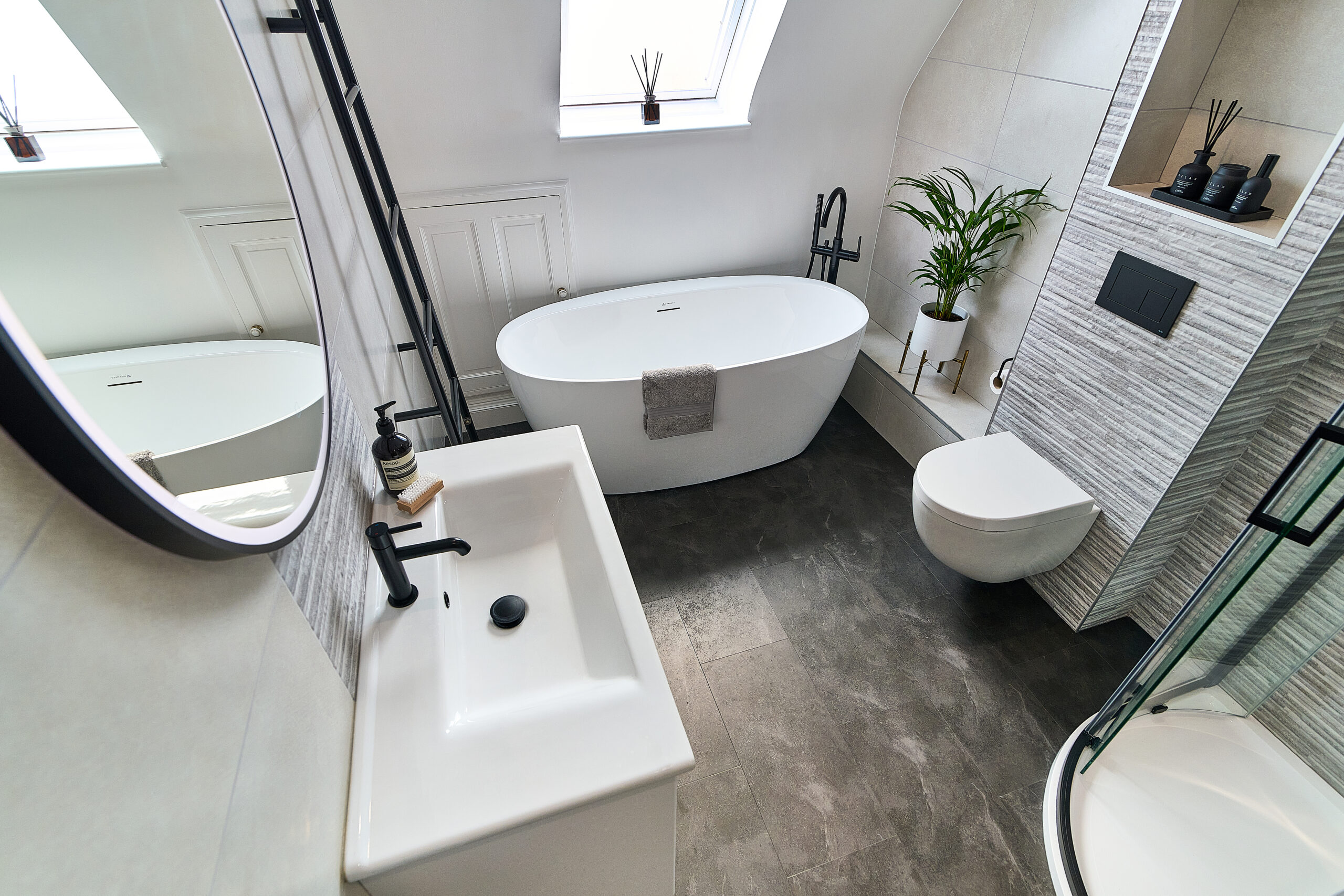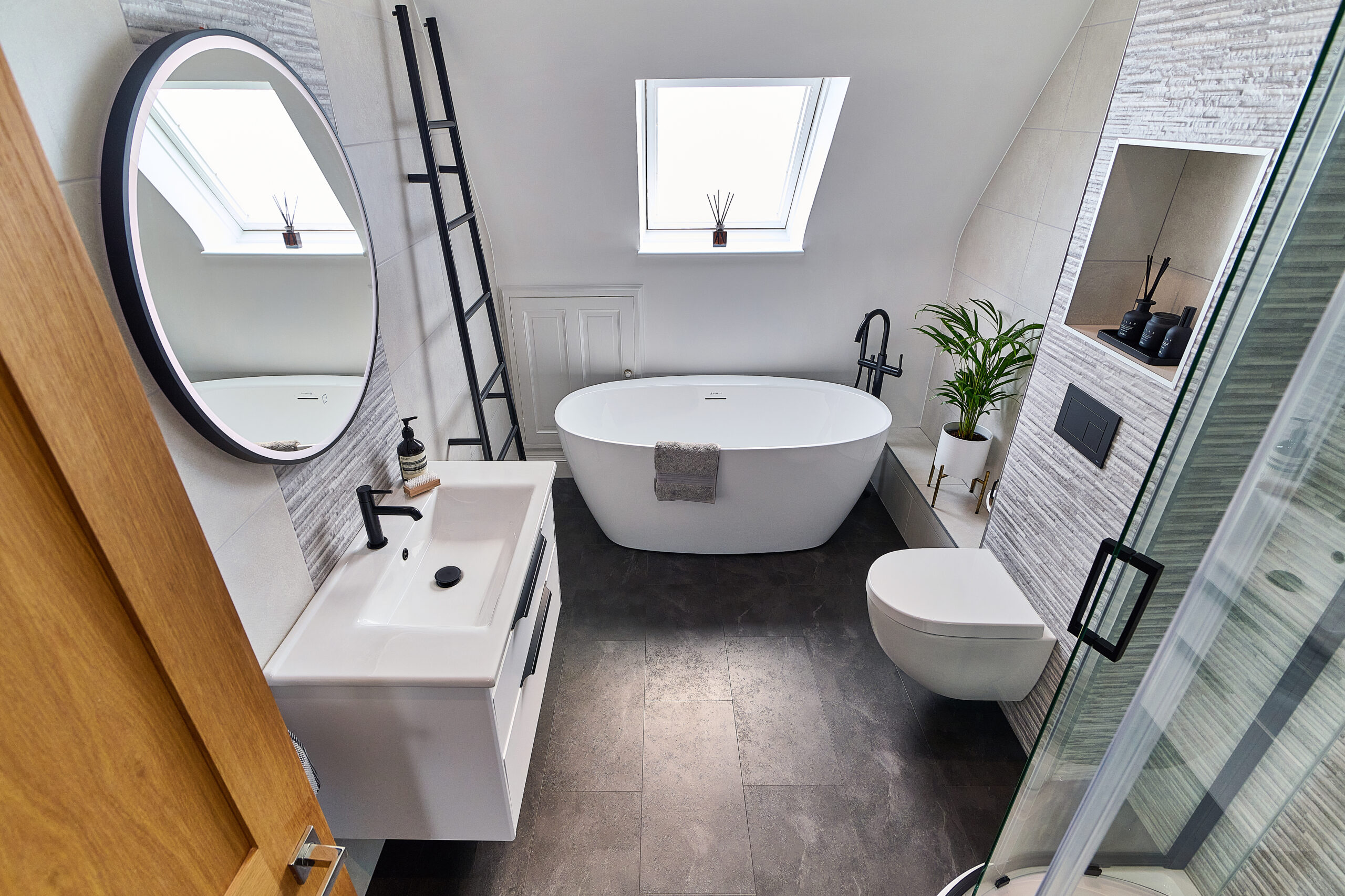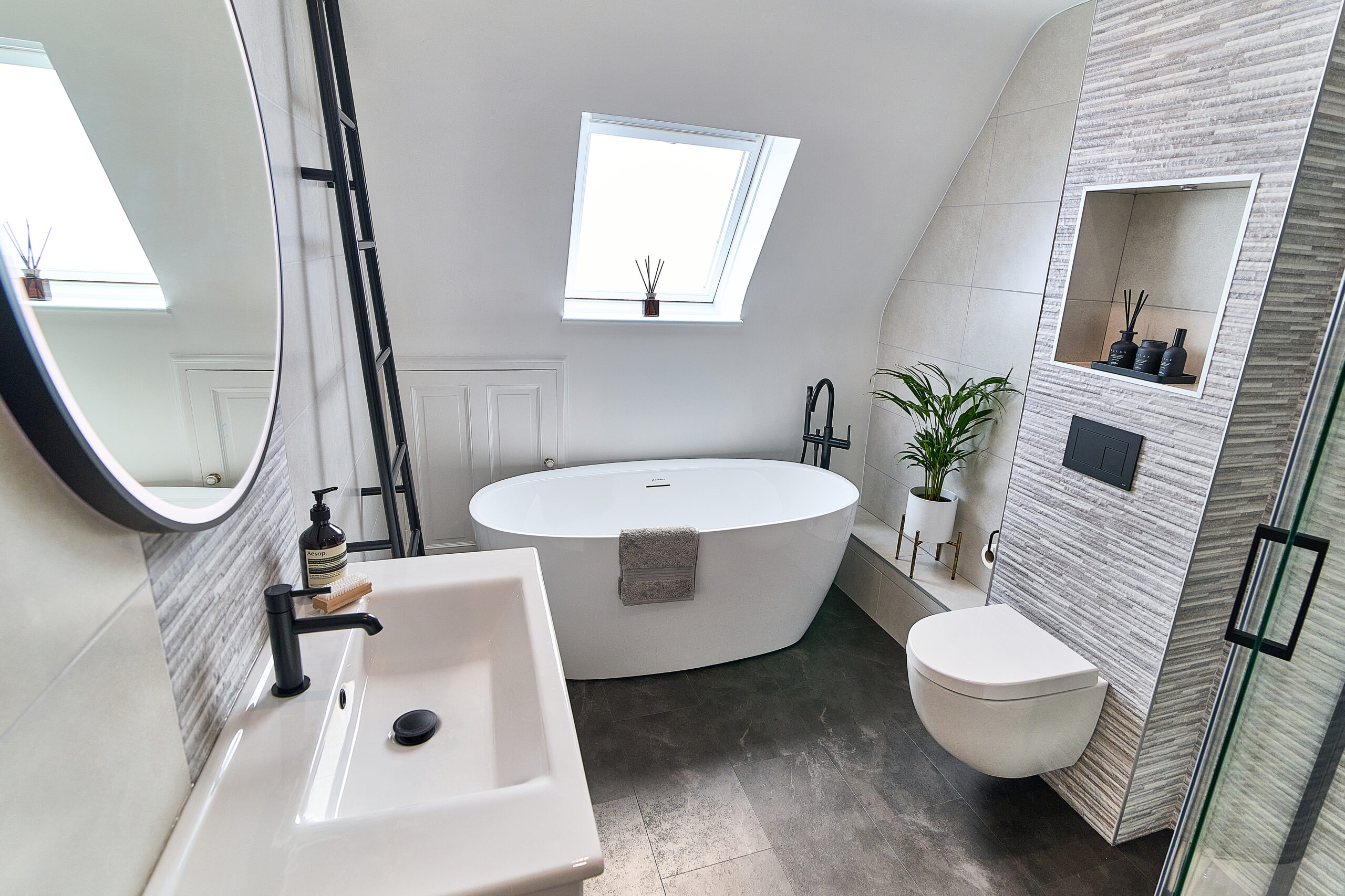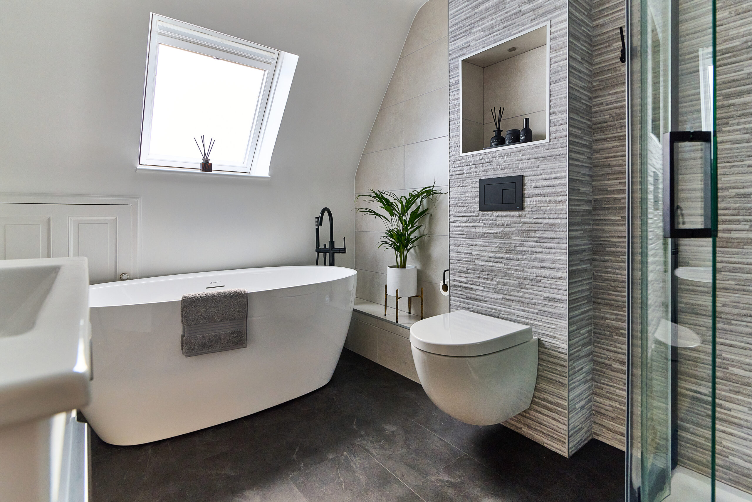 We designed the layout around a stunning freestanding bath, which became the focal point of the room. To make the WC area more interesting, we built the wall out to accommodate a concealed frame and added alcoves for extra storage. A wall-hung pan completed the sleek, modern look.