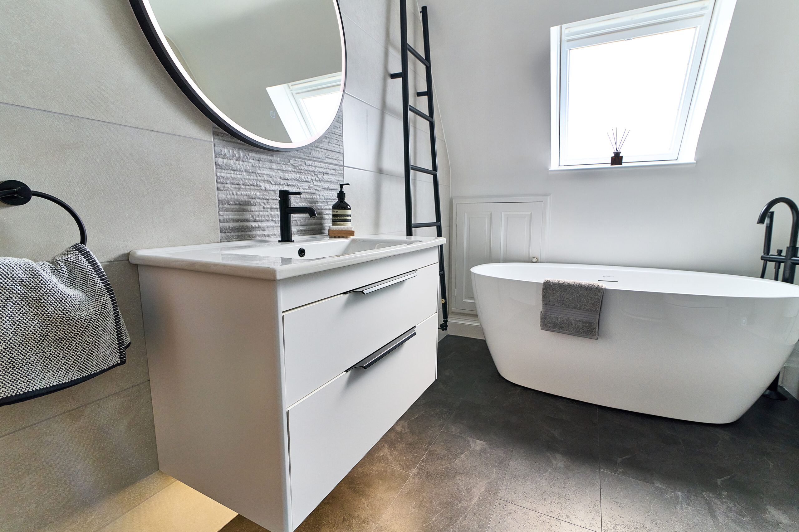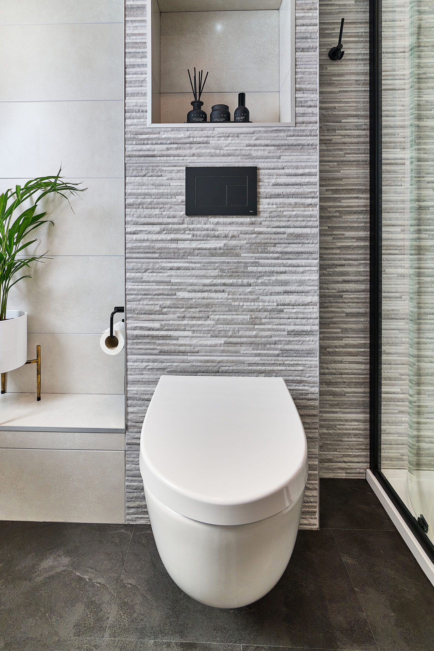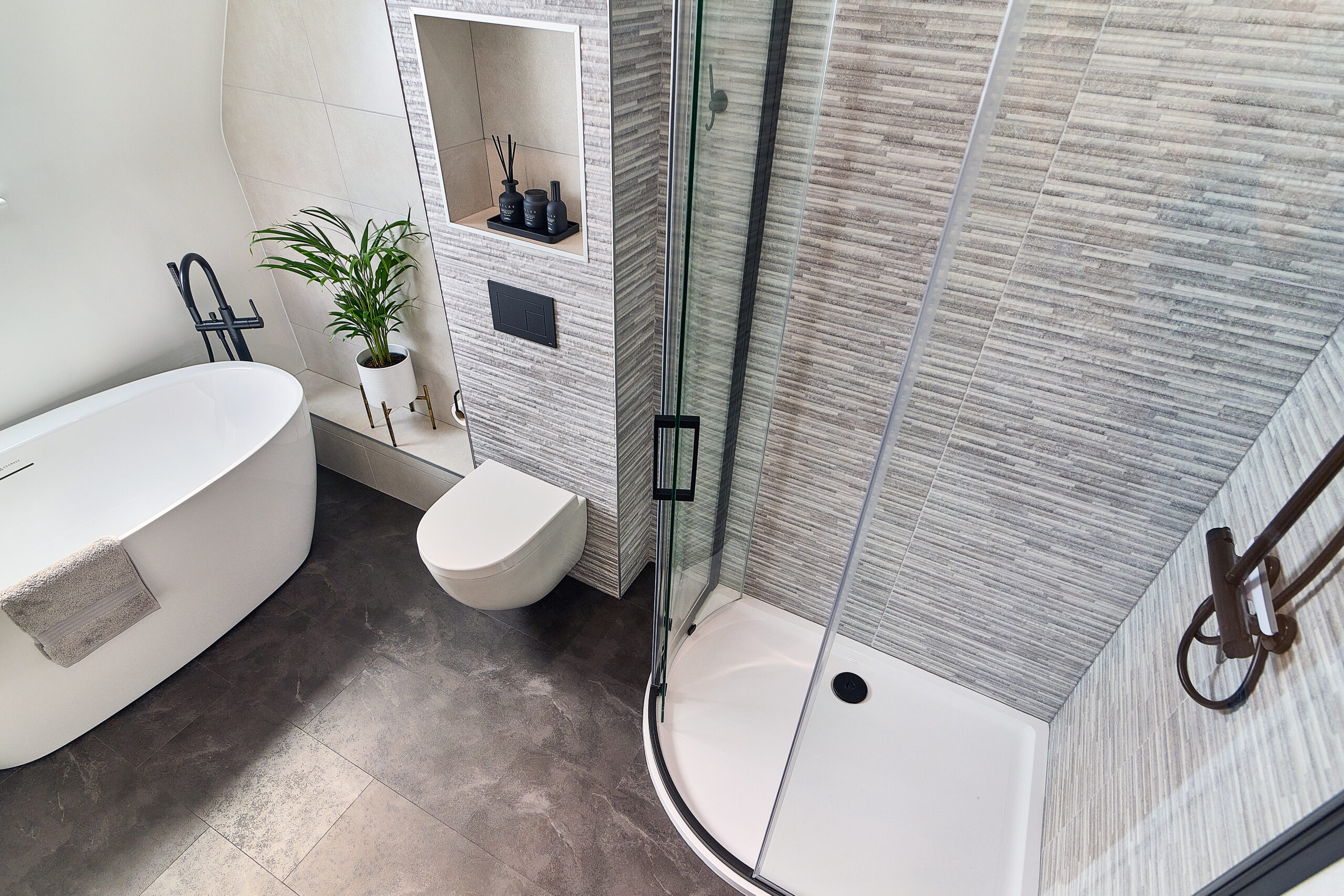 We designed the layout around a stunning freestanding bath, which became the focal point of the room. To make the WC area more interesting, we built the wall out to accommodate a concealed frame and added alcoves for extra storage. A wall-hung pan completed the sleek, modern look.