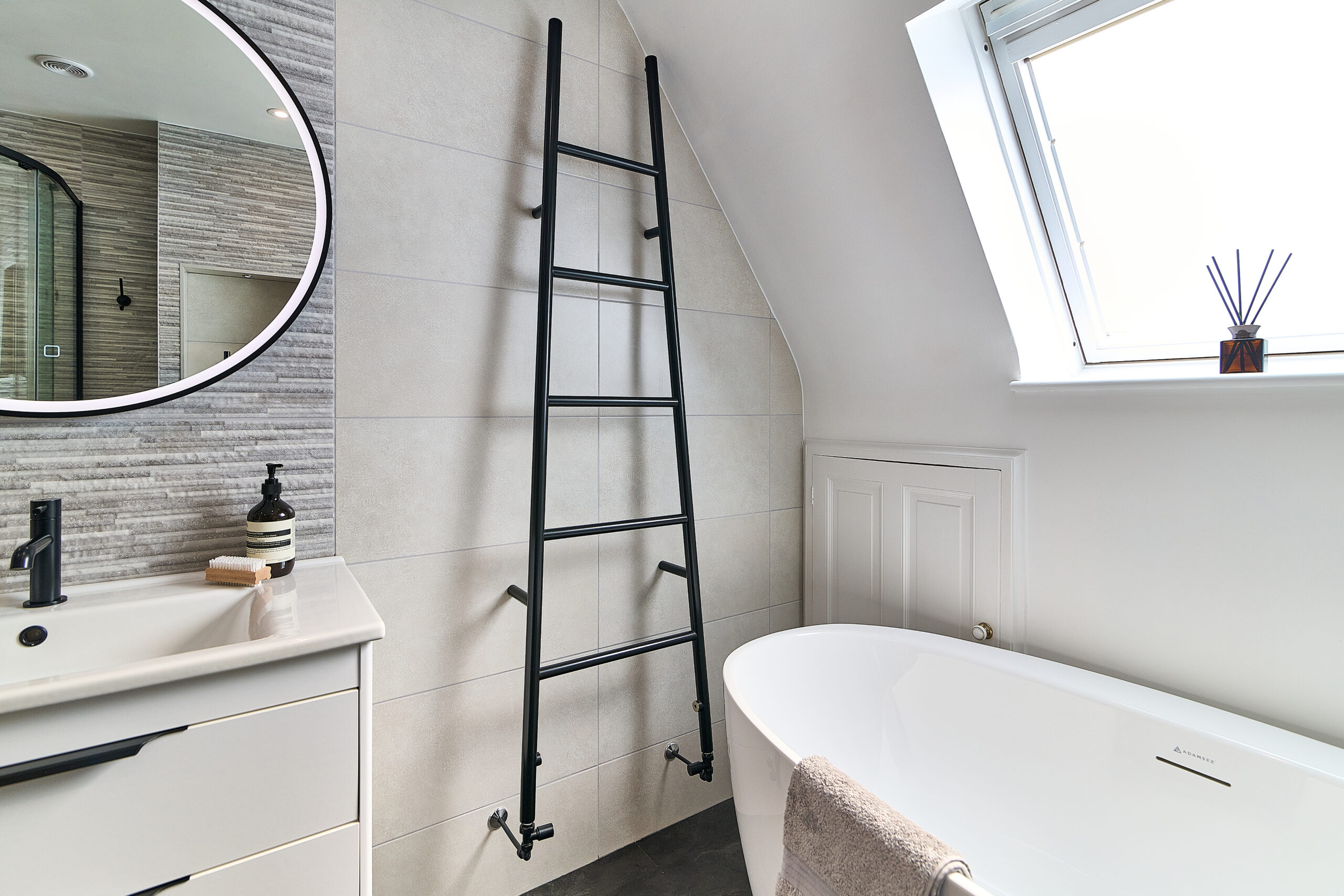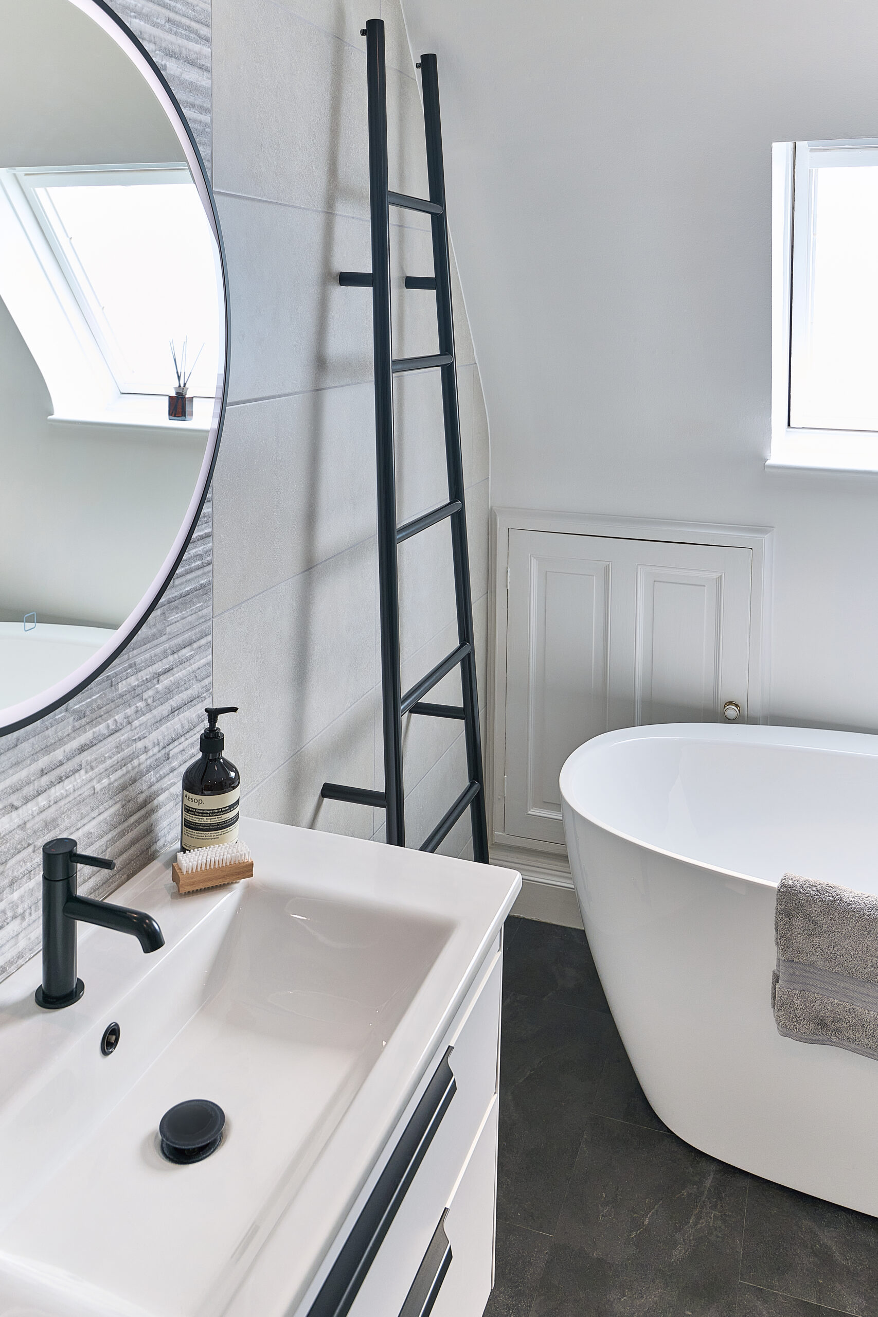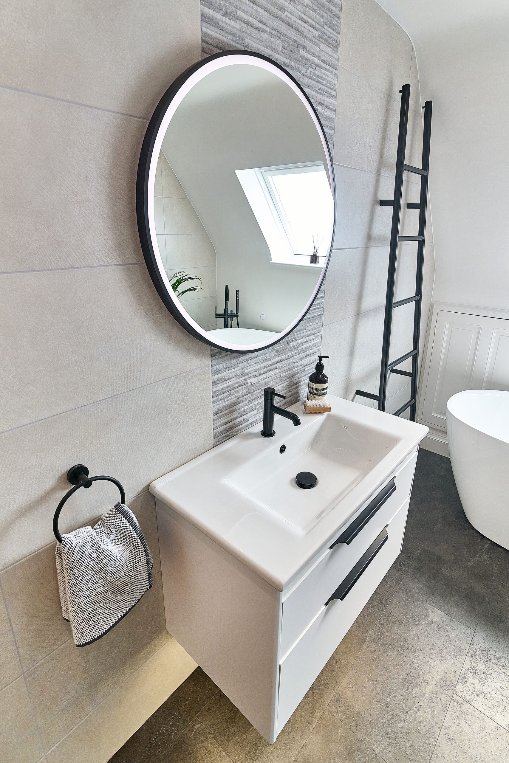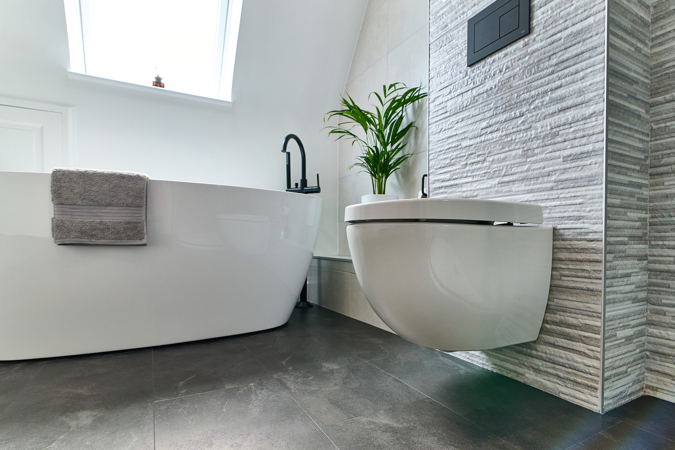 We designed the layout around a stunning freestanding bath, which became the focal point of the room. To make the WC area more interesting, we built the wall out to accommodate a concealed frame and added alcoves for extra storage. A wall-hung pan completed the sleek, modern look.