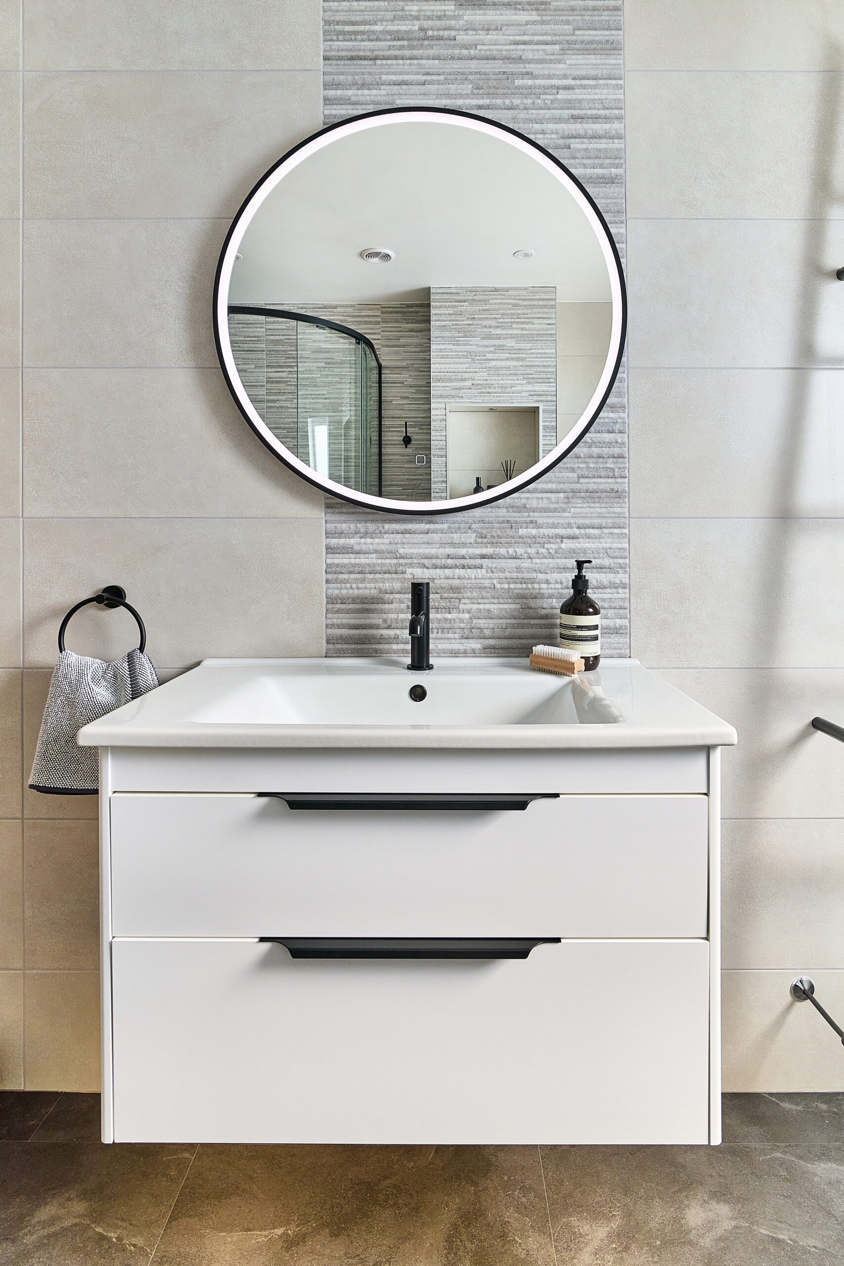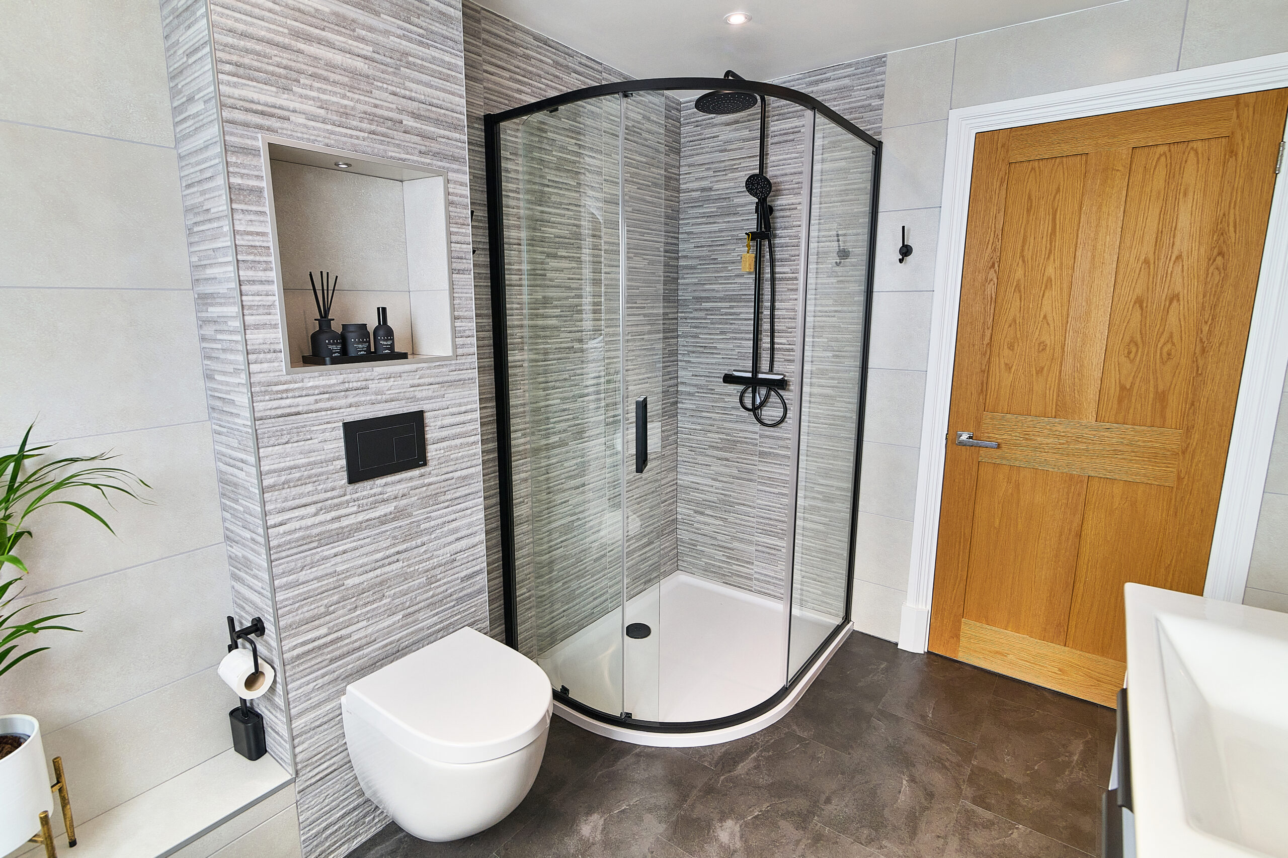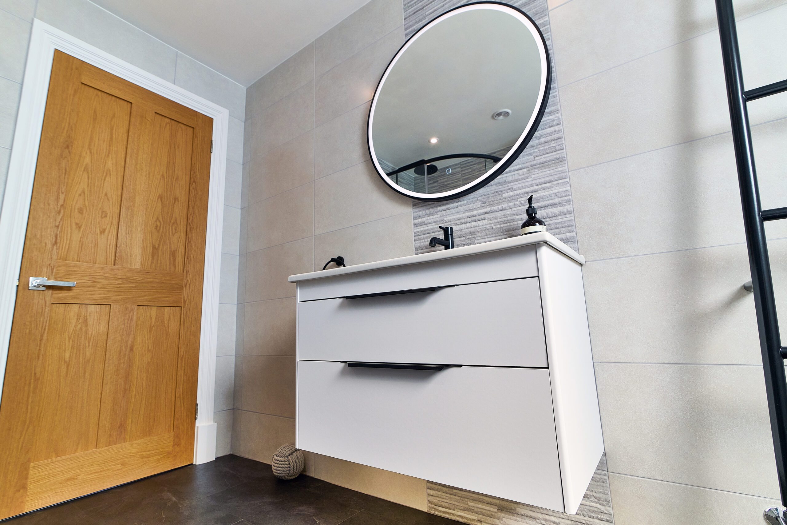 To complete this Atherstone bathroom, we used patterned tiles to bring texture and depth to the design and installed a click flooring system to create a seamless, easy-to-clean surface without the need for grout.