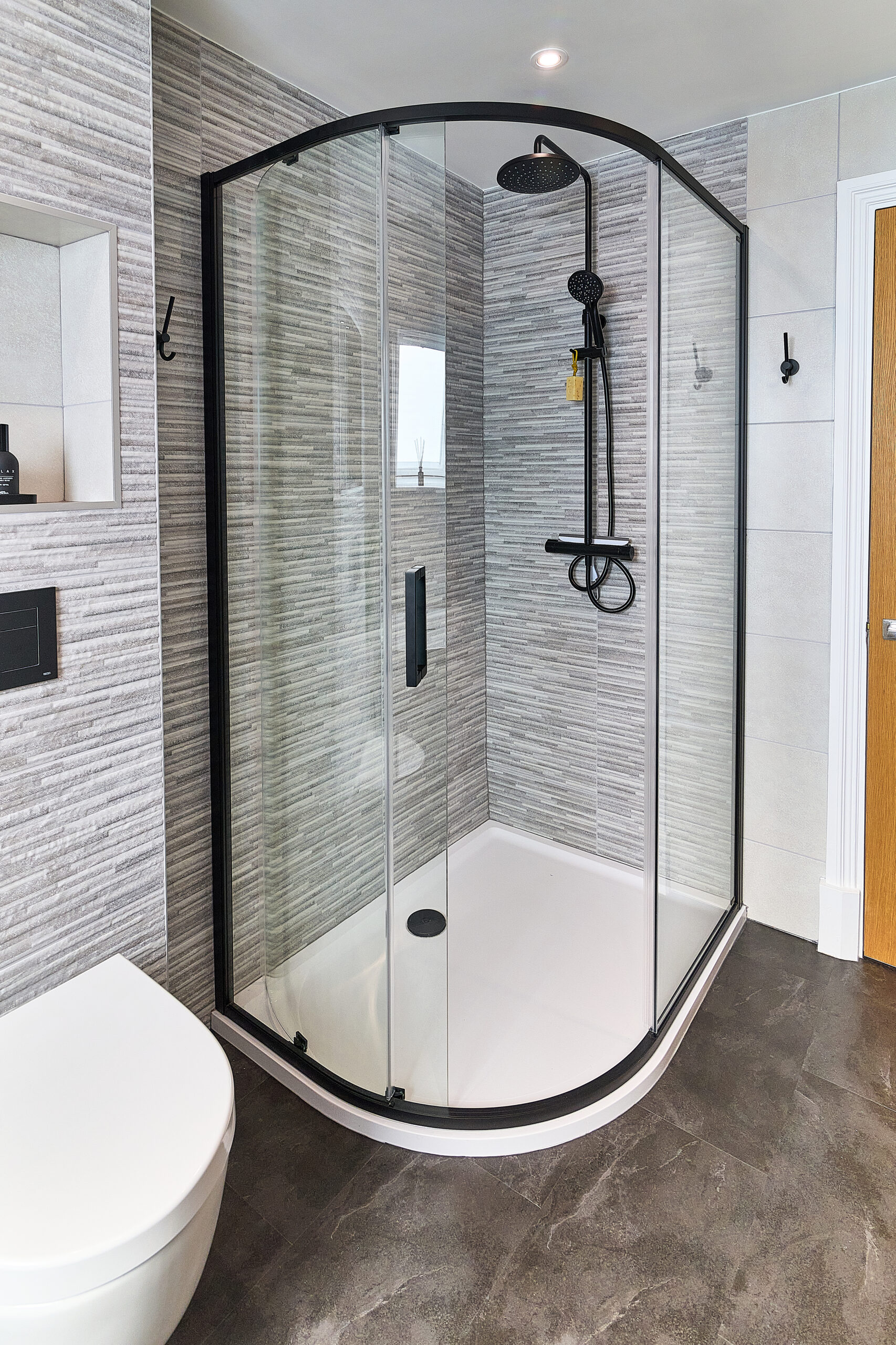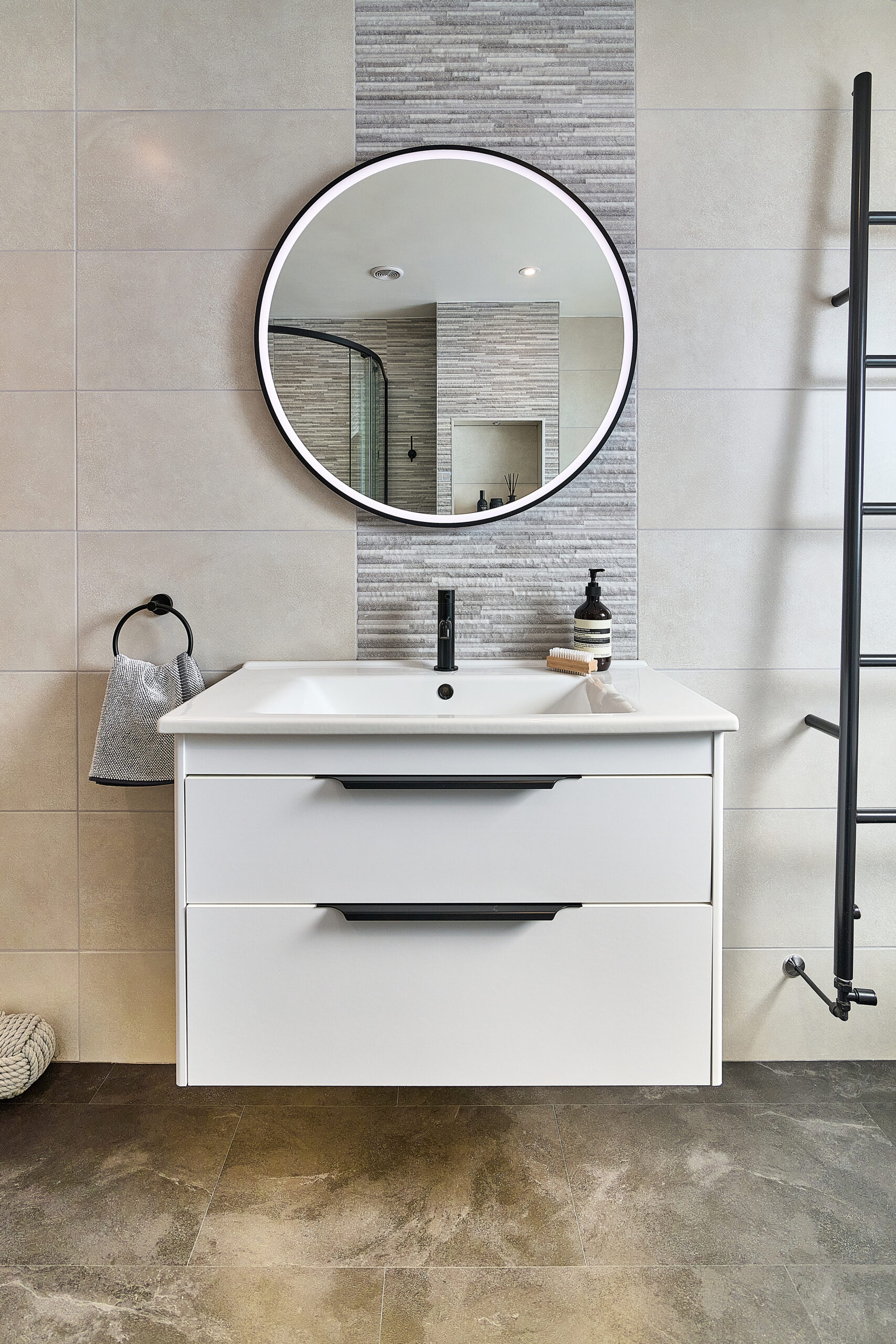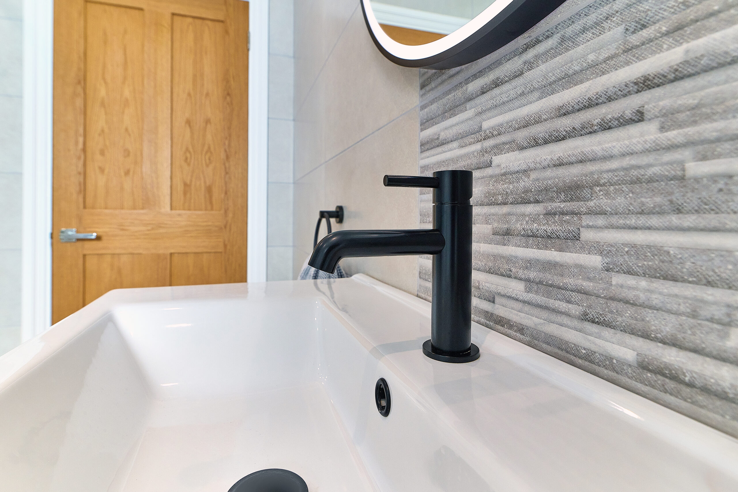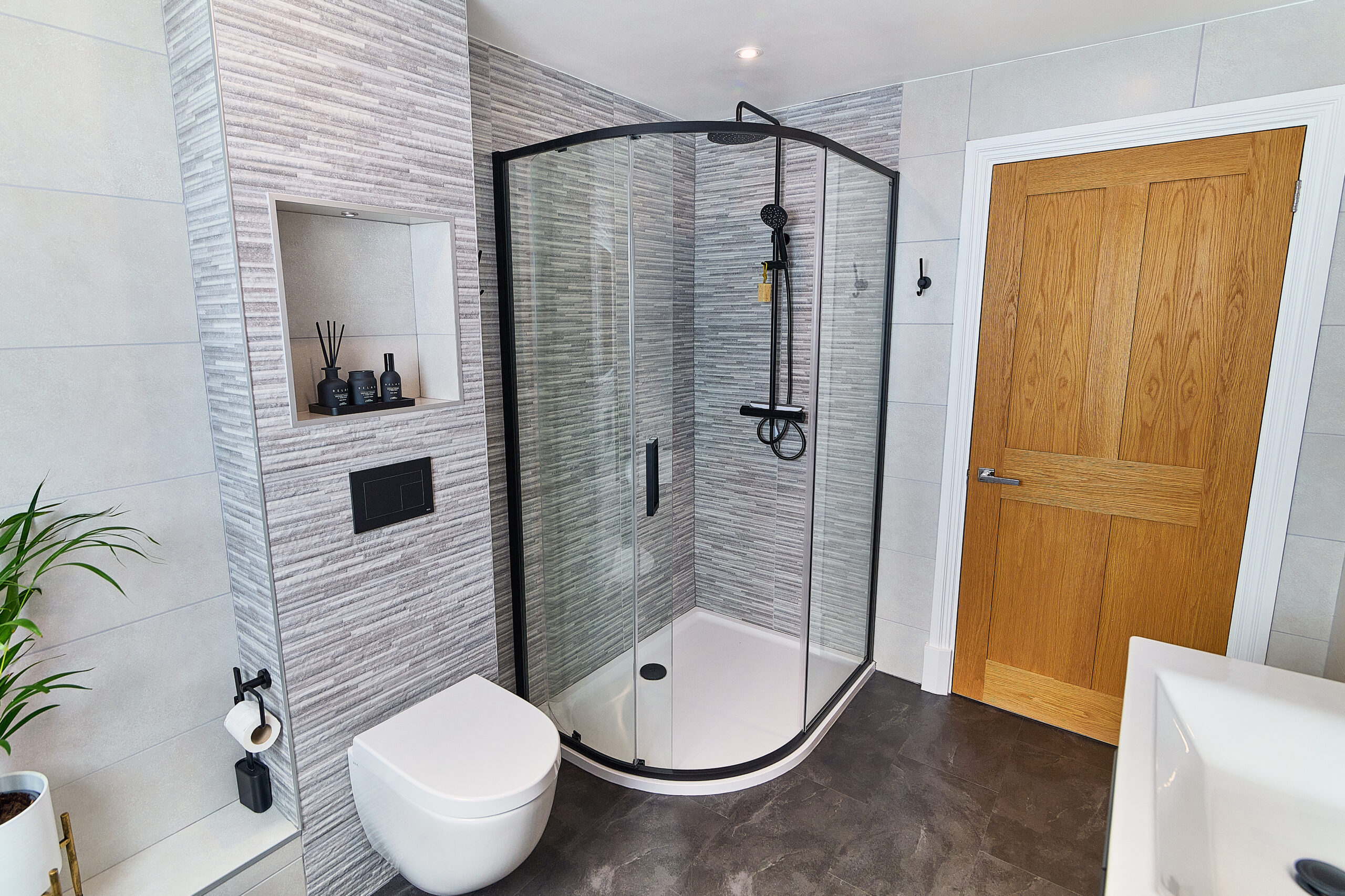 To complete this Atherstone bathroom, we used patterned tiles to bring texture and depth to the design and installed a click flooring system to create a seamless, easy-to-clean surface without the need for grout.