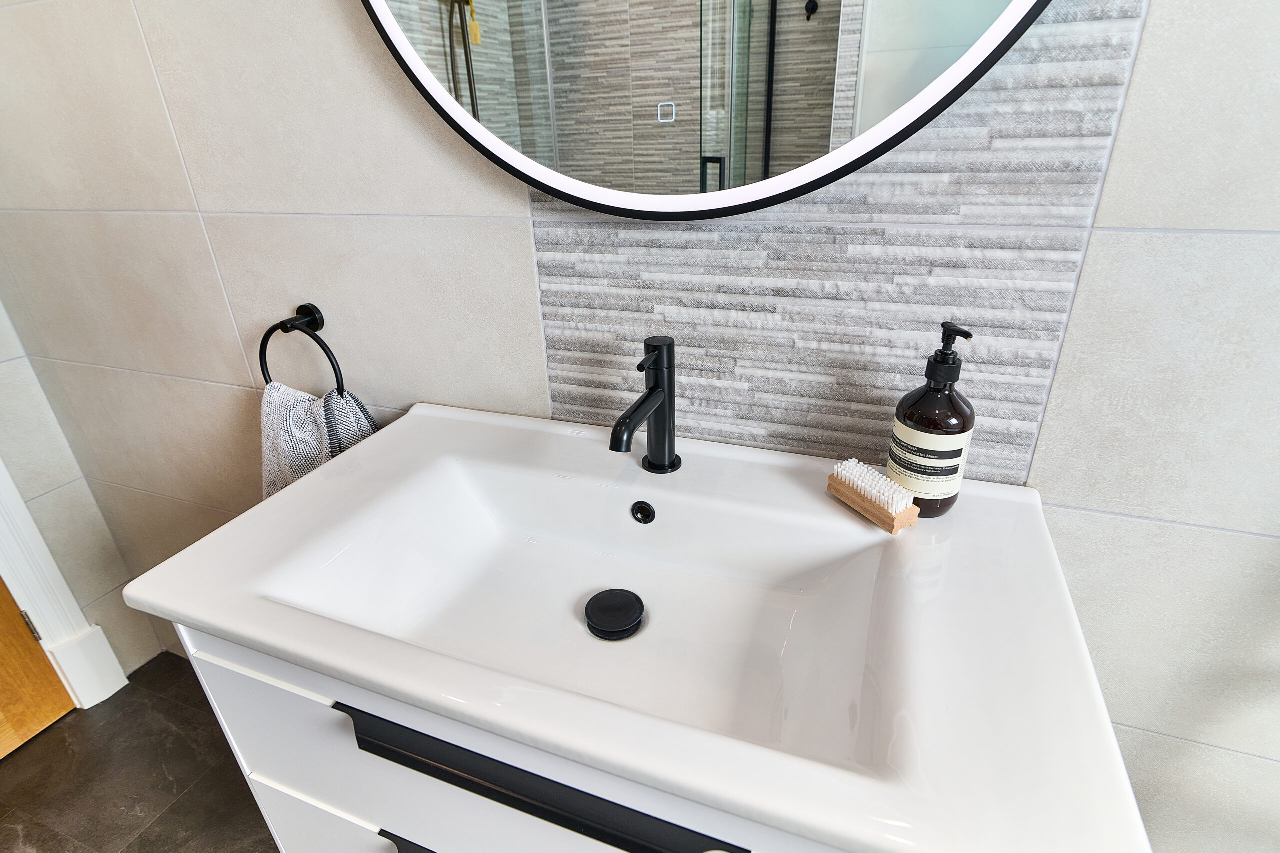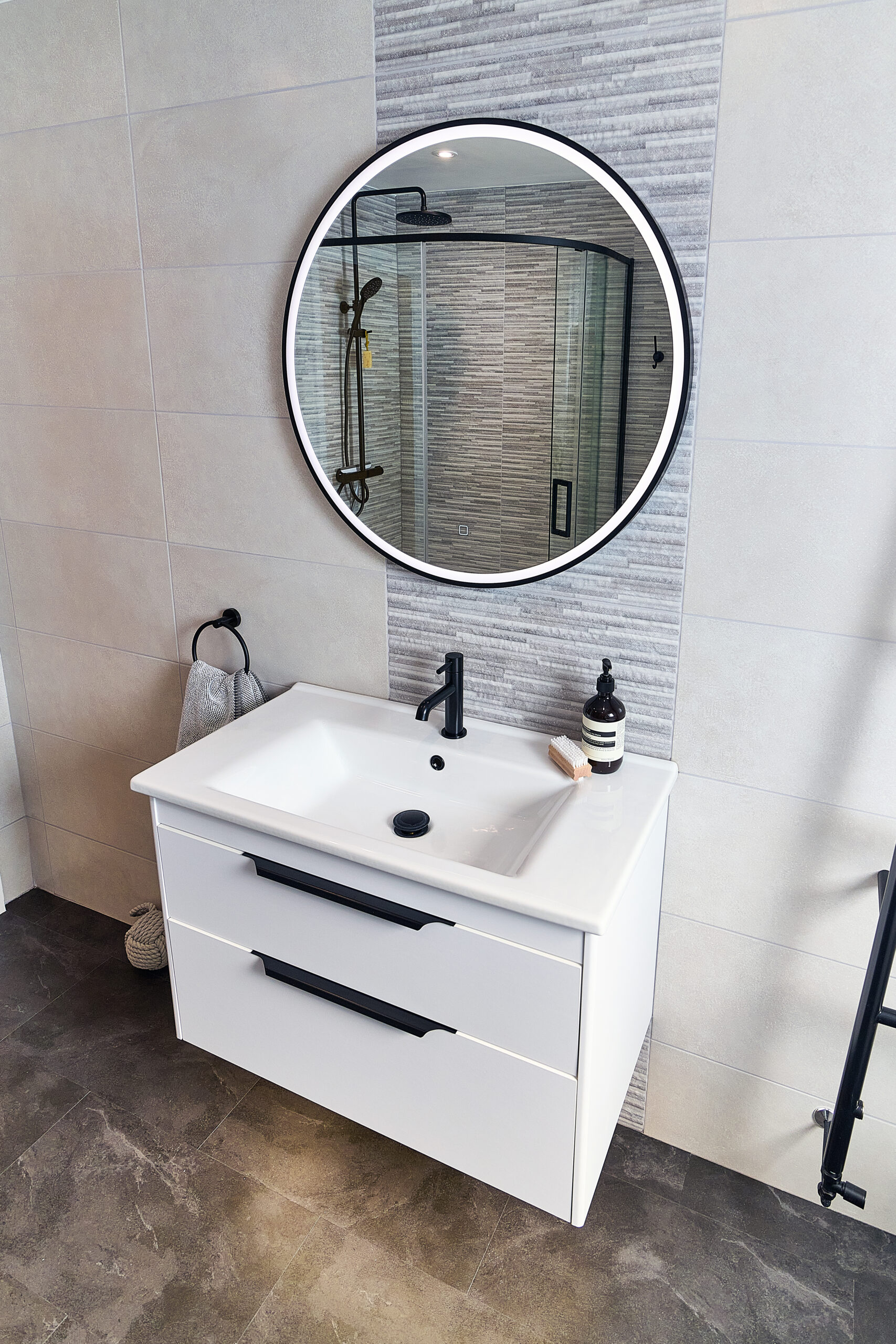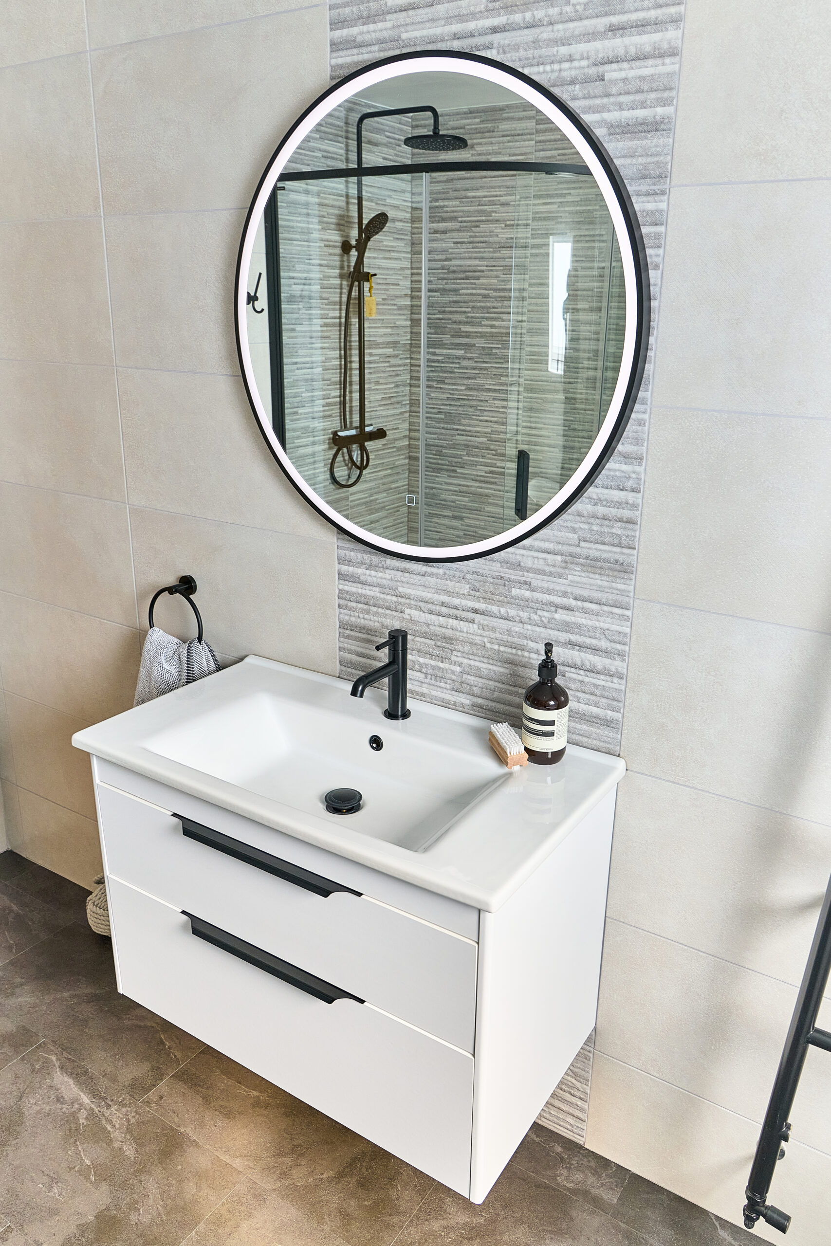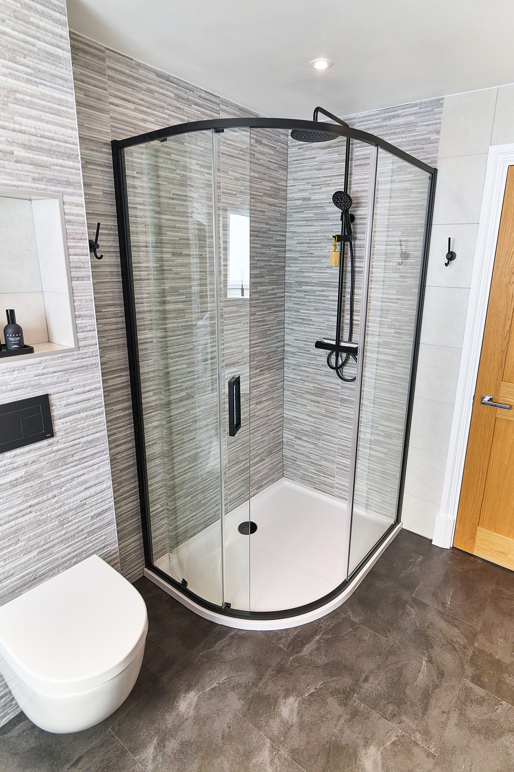 For the vanity area, a wall-hung basin unit with under-basin lighting provided both function and subtle nighttime illumination. A colour-changing LED mirror added ambiance and versatility to the space, while underfloor heating introduced a touch of everyday luxury—perfect for cooler mornings.